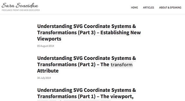 そして@SaraSoueidan さん。こちらの方からの情報源がほとんどと言っていいくらいです。FloridaのCSSConf US 2014でSVGについてお話しされた方です。ブログをみてもSVGをCSSで操作することについての記述が多いので、JSができない私にはちょうどよく理解できるという印象なのでよくみています。