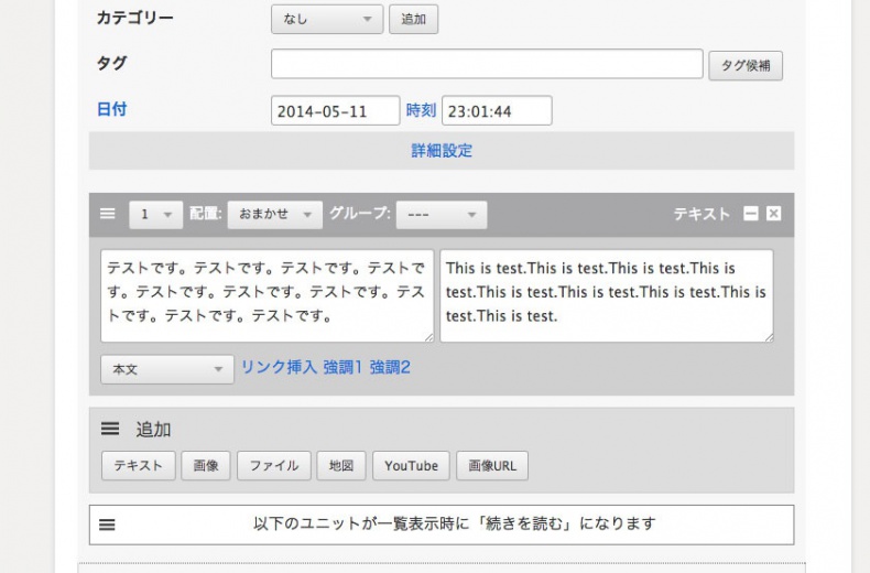 a-blog cmsでは、同じユニットにもう一つテキストエリアを追加することでマルチ言語対応を可能です。日本語のサイトと英語のサイトを作りたいとき、同じコンテンツは同じエントリーで管理することができるようになります。構成が変わらないので、場合によっては同じモジュールIDを使い回すことができて便利です。