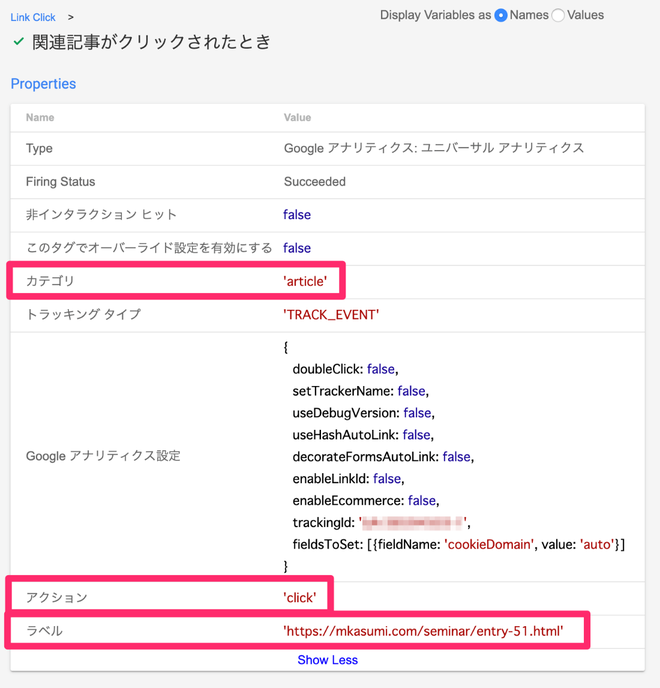 先ほどの Google Tag Manager の管理画面で「タグ」の項目に設定した、カテゴリ、アクション、ラベルの項目が実際のサイトでどのような値が適用されたか確認できます。