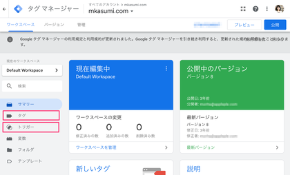 今回は左メニューにもある、「タグ」と「トリガー」の設定を行います。
