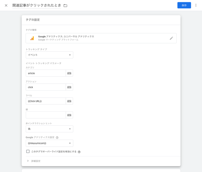 | Google アナリティクス設定 | あらかじめアナリティクスのコードを設定した変数 |