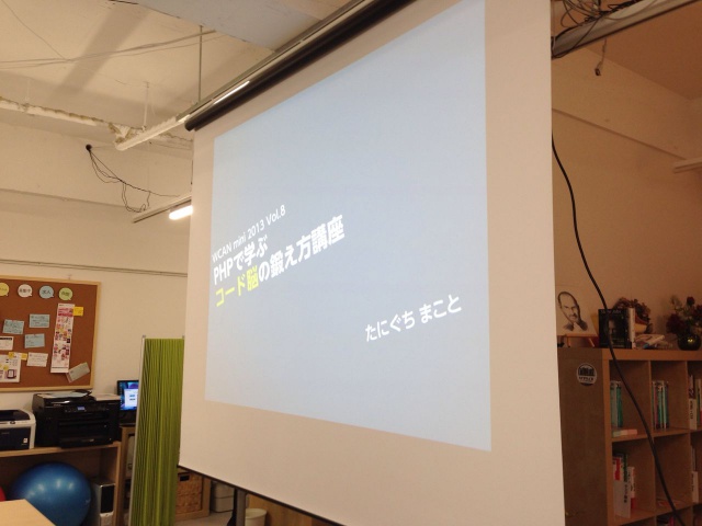 たにぐち まこと さんによる、WCAN mini 2013 Vol.8〜プログラミングのニガテ克服セミナー PHPで学ぶ、「コード脳」の鍛え方〜に参加しました。 たにぐちさんのお話を聞くのは、WCAN2013 spring(WCAN2013springに参加してきました!SESSION2 「Bootstrapでつくる、いまどきのレスポンシブ・Webデザイン」| mkasumi.com)でのBootstrapのお話以来になります。他にもたにぐちさんの本を読んだことがあるのですが、とてもわかりやすく書かれていておすすめです。