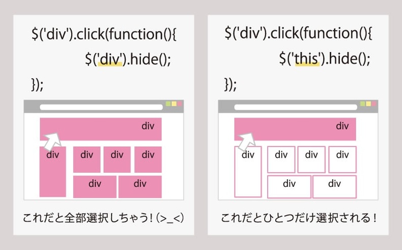 自分だけってときは「this」を使う。つまりは、thisを使った時はfunctionの自分(画像だとdivに当たる)をさすのがthisっていうキーワードになります。